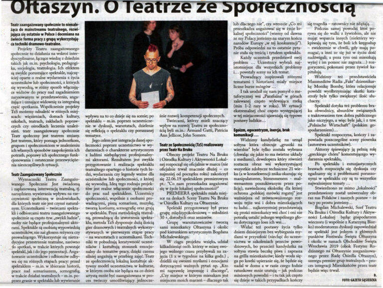 Spektakl Teatru Młodzieżowego „Co nam przeszkadza być szczęśliwymi?” w Ośrodek Kultury na Ołtaszynie (pod kierunkiem Bogdan Michalewski – Teatr Na Bruku ) obejrzeć powinni: rodzice, młodzież, wychowawcy, dziadkowie, sąsiedzi, jednym słowem – wszyscy. Nie tylko z powodu Gazety Sąsiedzkiej występującej na scenie w charakterze rekwizytu. Spektakl jest mądry, poruszający i zaskakująco dobrze zagrany