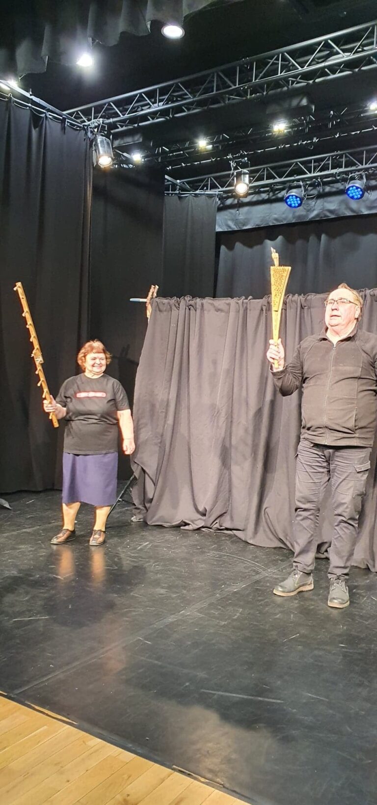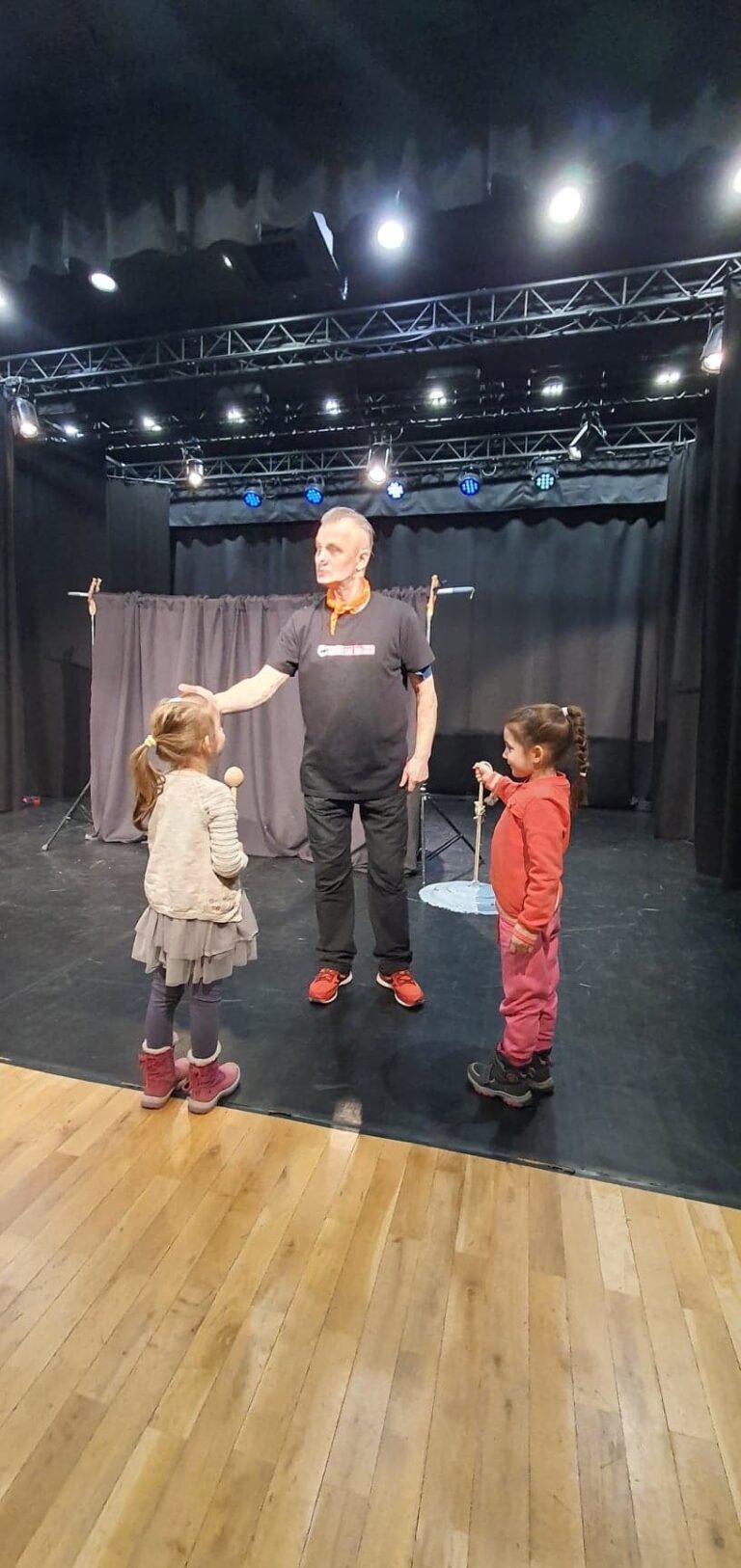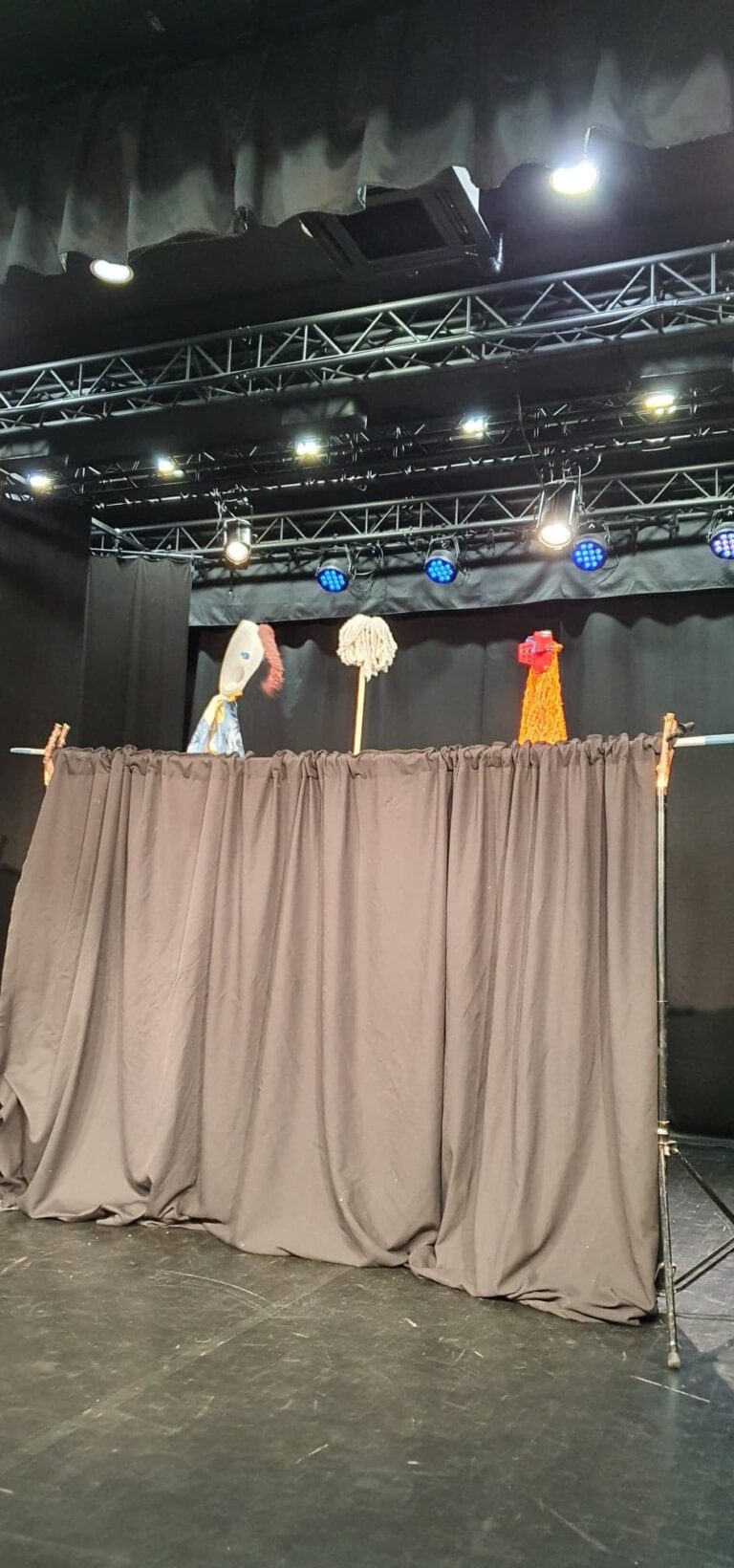 Na oczach widzów, aktorzy budują scenę oraz lalki metodą „coś z niczego” prezentując instruktarz uprawiania teatru lalek.