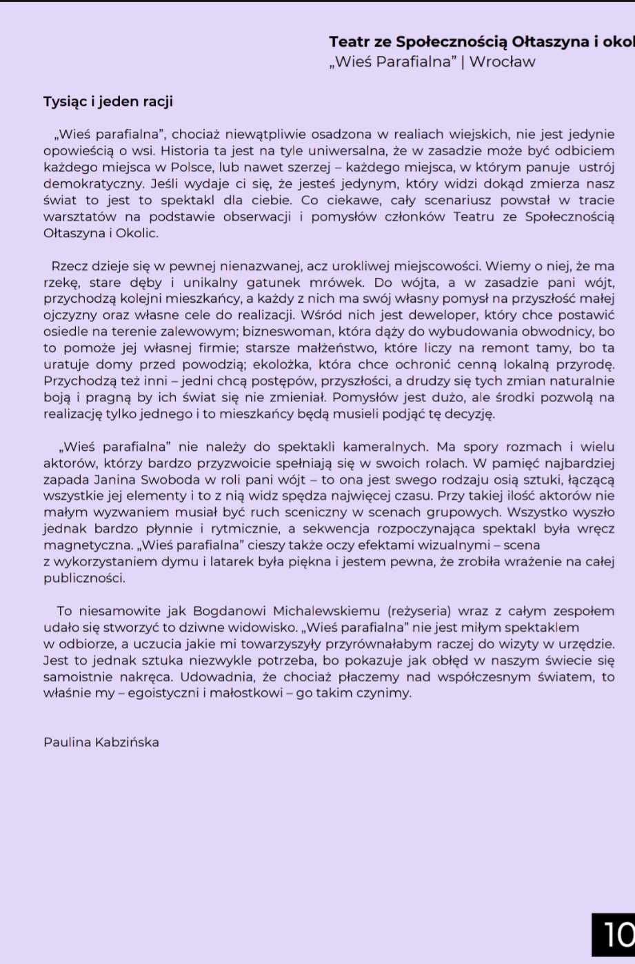 Sztuka obywatelska o nas – Polakach. Pełna humoru i dramatu opowieść, która jak w soczewce skupia najważniejsze problemy dnia codziennego mieszkańców Ołtaszyna, Wrocławia, a może i całej Polski.